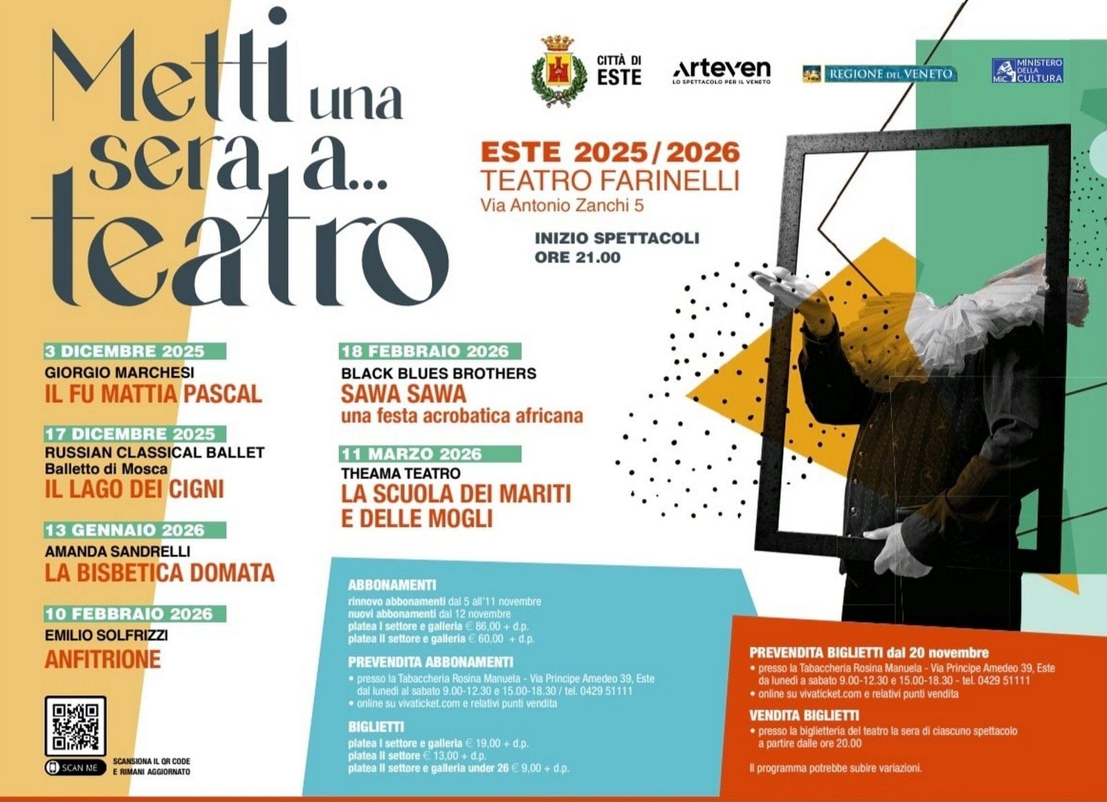 Prevendita abbonamenti: presso Punto Servizi Rosina Via Principe Amedeo, 39 ESTE – tel.: 0429 51111 – dal lunedì al sabato dalle ore 09:00 alle 12:30 e dalle ore 15:00 alle 18:00 oppure on line su VIVATICKET.COM e relativi Punti vendita VIVATICKET